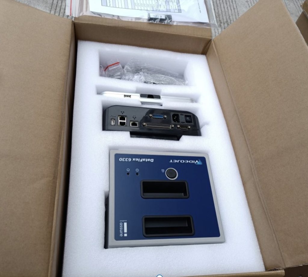 На этом изображении показана настоящая упаковка системы Videojet 6330, включая: