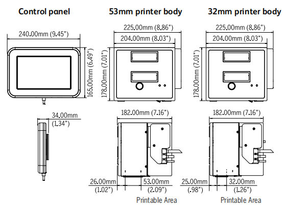 - режим непрерывной печати 32 мм: ширина 1,3 дюйма (32 мм) и длина 7,9 дюйма (200 мм)